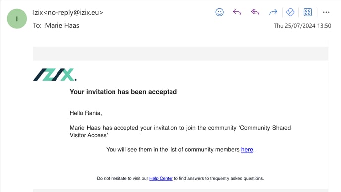 Following the validation, a confirmation email will be sent to the member organisation administrator (=the invited profile) and the owner organisation administrator (=who sent the invite):