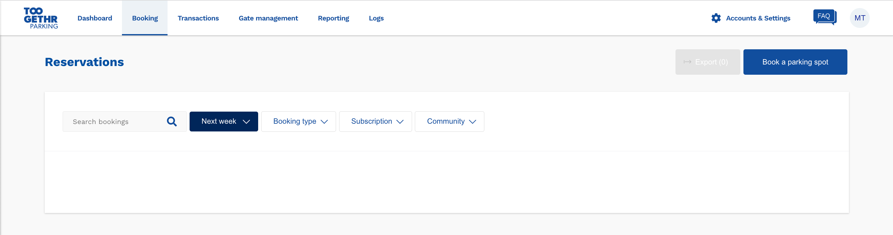 1. Go to the Booking tab on the Toogethr Parking dashboard and click on Book a parking spot.