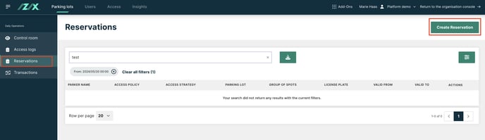 Start from the "Parking management Interface" -> "Reservations" -> "Create Reservation":