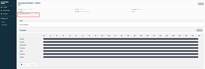 Parking list → Select the parking → Management of accesses → Click “Show” on the desired access strategy → Edit the entrance method