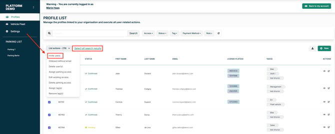 - Inviter plusieurs profils : Accédez à la liste des profils, sélectionnez les utilisateur*rice*s concernés et utilisez l’action groupée « Inviter des utilisateurs »: