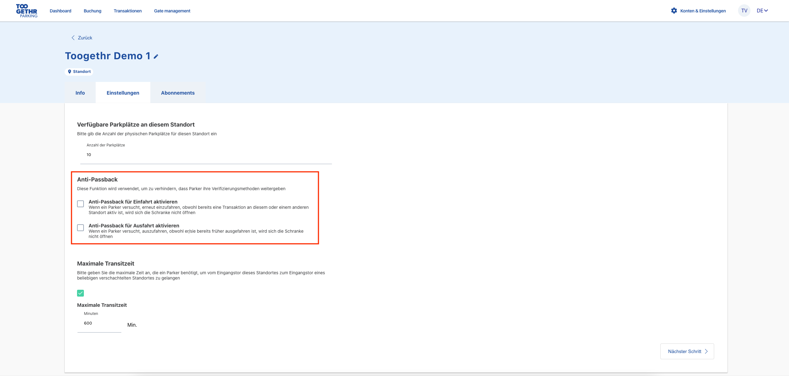 Ist diese Funktion aktiviert und ist ein Parker bereits an einem der angeschlossenen Standorte ausgefahren, wird sich die Schranke kein weiteres Mal öffnen. Anti-Passback soll verhindern, dass die Verifizierungsmethoden eines Parkers für standortübergreifende Mehrfachausfahrten genutzt werden können.