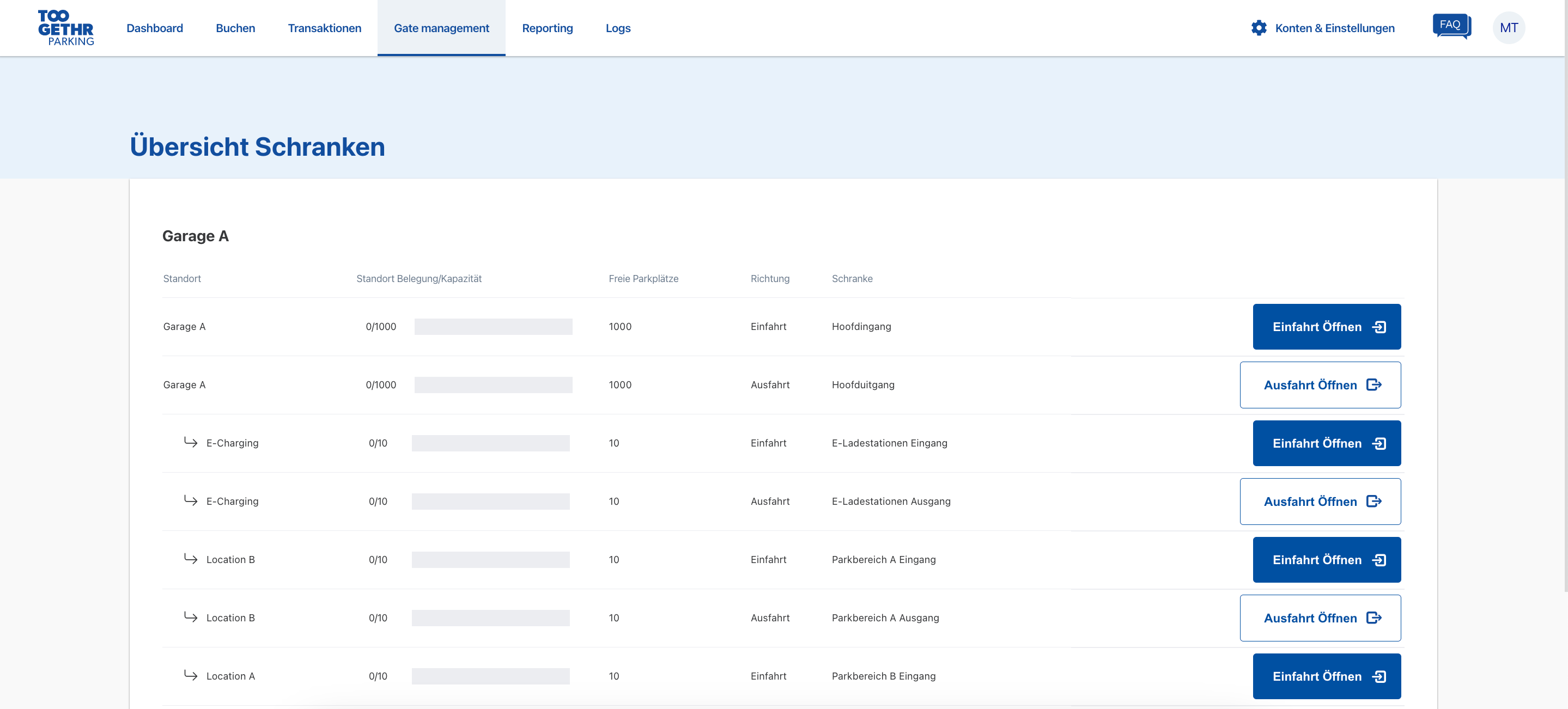 1. Sie finden die Gate-Verwaltung oben im Dashboard der Toogethr Parking-App.