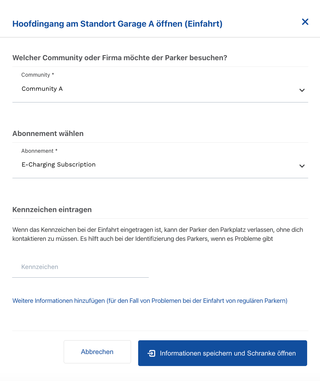 5. Klicken Sie auf Informationen speichern und Schranke öffnen. Liegt eine Buchung durch den Parker vor, wird eine Transaktion durchgeführt und die Buchung gestartet. Liegt keine Buchung vor, wird lediglich eine Transaktion auf das Abonnement der entsprechenden Community gestartet.