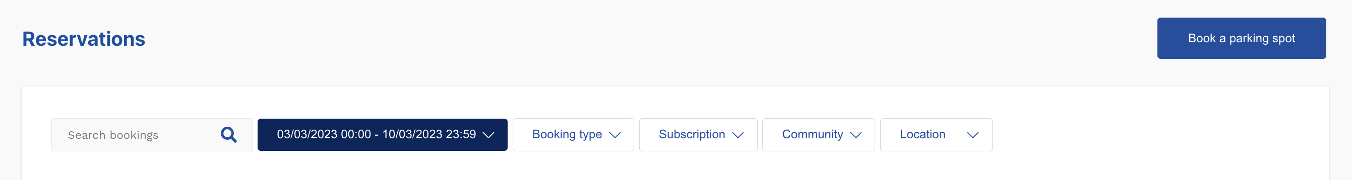 Heeft de parkeerder een reservering gemaakt of is er een reservering voor hem of haar gemaakt. Dan is deze terug te vinden onder het kopje reserveringen. Zoals te zien is op onderstaande afbeelding kan er gefilterd worden op onder andere: type boeking, het abonnement, de community en de locatie. Zo vind je de reservering snel terug!
