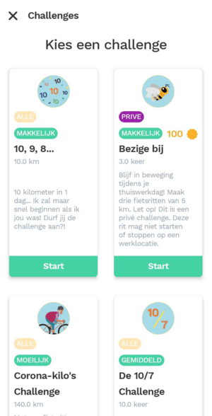 - Werk challenge* – alleen ritten die starten of eindigen op een werklocatie tellen mee voor deze challenges.