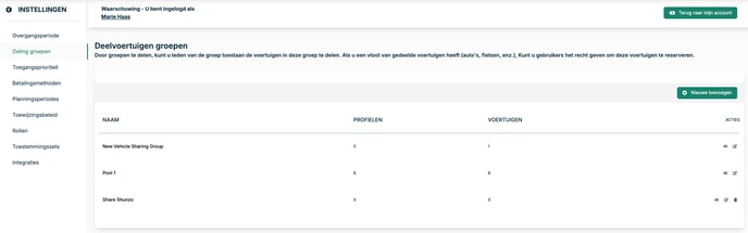 Om een gebruiker toegang te geven tot een fleet vehicle sharing group, gaat u naar het profiel en bewerkt u de toegang tot de sharing groups. Dit moet voor elk profiel afzonderlijk worden gedaan.