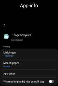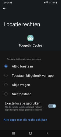 Extra voor iOS 14 (of hoger): ga naar "Instellingen" > "Privacy" > "Locatie(voorzieningen)" > klik op de Toogethr app en zet het schuifje bij "Exacte Locatie" aan.