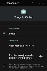 Om het juiste aantal punten voor je ritten te krijgen en om de webshop te kunnen bekijken, vragen we je om je GPS aan te zetten en Toogethr toegang te geven tot je locatievoorziening.