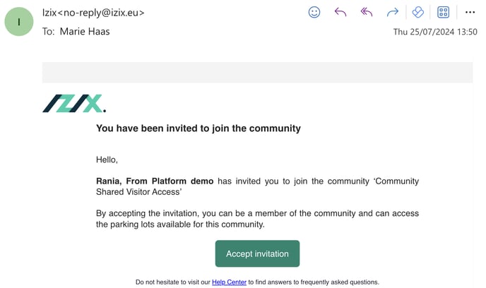 De uitgenodigde lidorganisatie (beheerder) ontvangt een uitnodiging per e-mail: