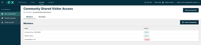 Bijvoorbeeld, als Ana lid is van Paradise Offices, dat toegang heeft tot de community (maar geen eigenaar is), dan zal Paradise Offices in de toegangslogs kunnen zien dat Ana het parkeerterrein heeft betreden via communitytoegang.