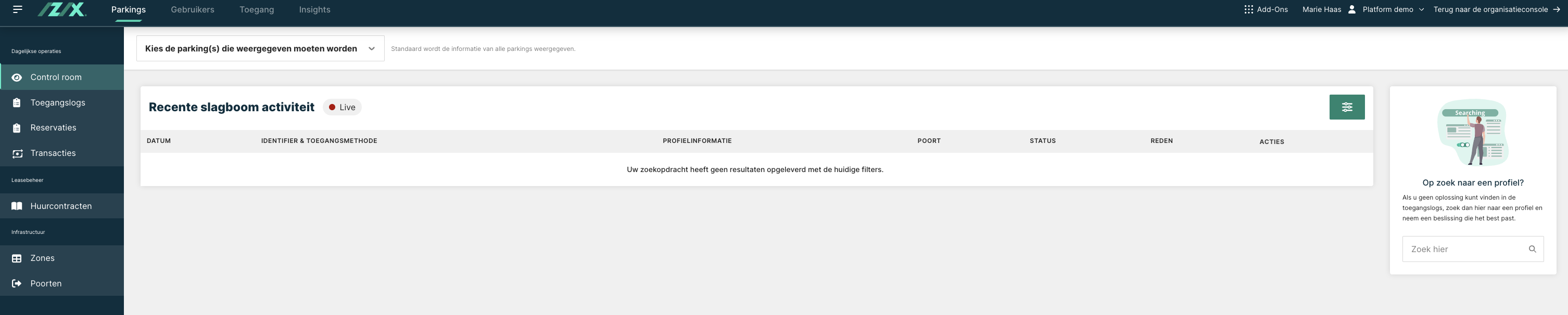 - Overzicht, zoeken & filteren van de live & historische toegangen tot de parking (=toegangslogs)